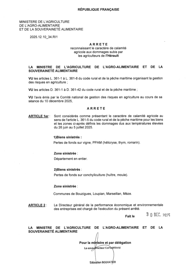 Ci-dessous, l’arrêté ministériel du 30 décembre 2025 portant reconnaissance du caractère de calamité agricole aux dommages subis par les agriculteurs de l’Hérault.